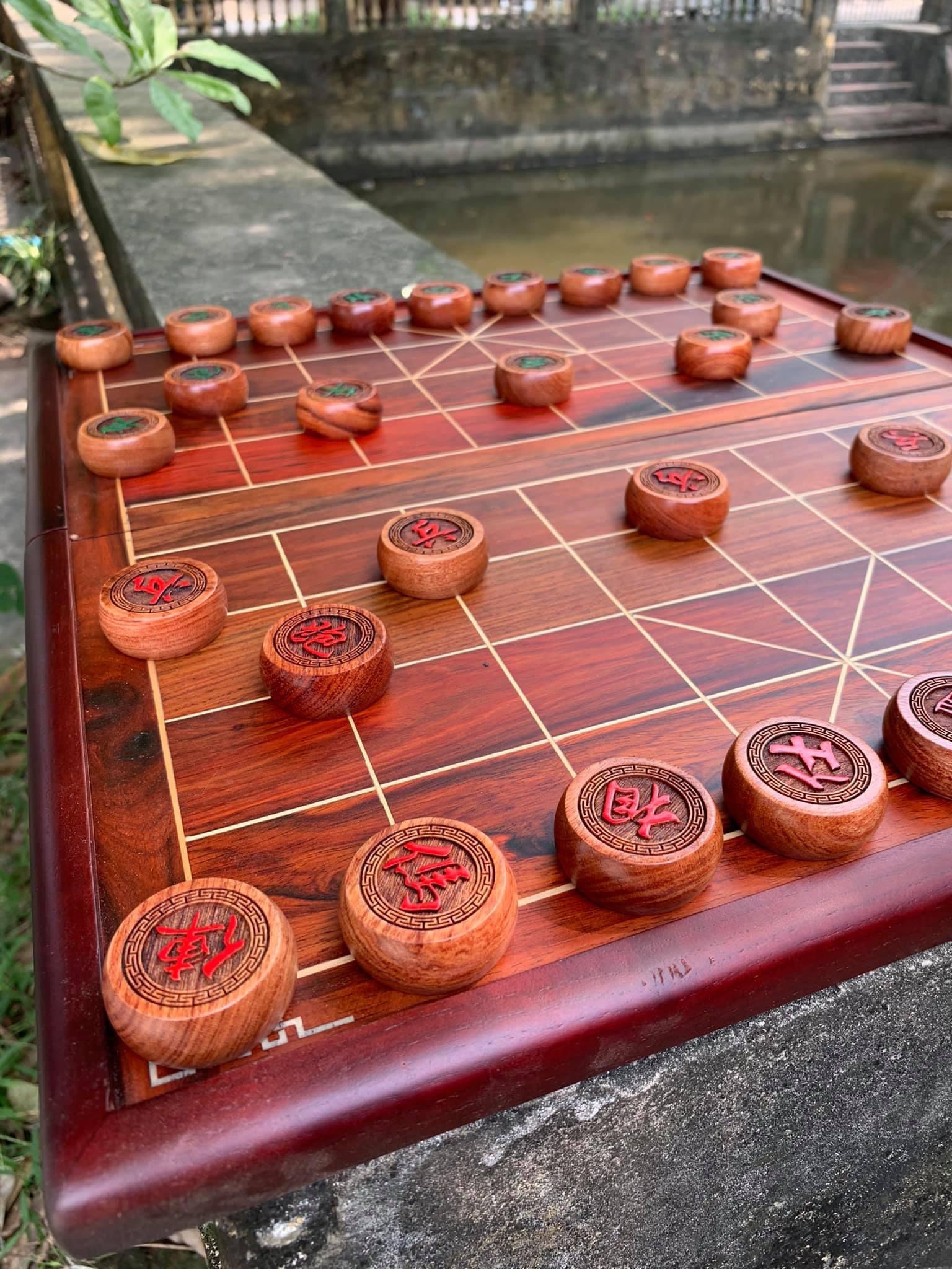 Mặt quân cờ được khắc tinh xảo 2 mặt rất tiện dụng cho việc sắp xếp cờ trên bàn. được sơn 2 màu trắng và đỏ. bàn cờ có vân gỗ tự nhiên rất đẹp